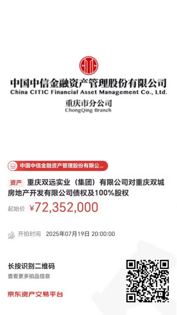 重慶雙遠實業(yè)(集團)有限公司持有重慶雙城房地產(chǎn)開發(fā)有限公司債權(quán)和100%股權(quán)。重慶雙遠實業(yè)(集團)有限公司將于2025年7月19日20時至2025年7月20日20時在京東拍賣網(wǎng)通過公開競價方式進行處置,拍賣鏈接如下圖所示,現(xiàn)予以公告。