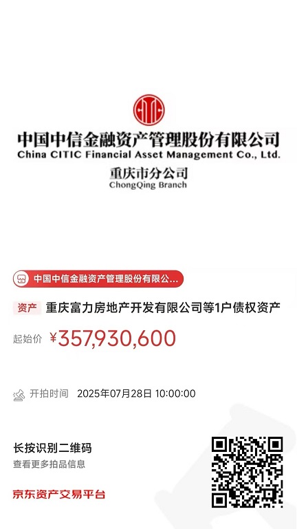 中國(guó)中信金融資產(chǎn)管理股份有限公司重慶市分公司(以下簡(jiǎn)稱“中信金融資產(chǎn)重慶分公司”)持有的對(duì)重慶富力房地產(chǎn)開發(fā)有限公司等1戶債權(quán)資產(chǎn)定于2025年7月28日10時(shí)至2025年7月29日10時(shí)止(延時(shí)的除外)在京東資產(chǎn)交易平臺(tái)(網(wǎng)址https://zcpm.jd.com/)進(jìn)行公開競(jìng)價(jià)活動(dòng),拍賣鏈接如下圖所示,競(jìng)拍相關(guān)事宜詳見拍賣鏈接里的競(jìng)拍公告及競(jìng)拍須知,現(xiàn)予以公告。